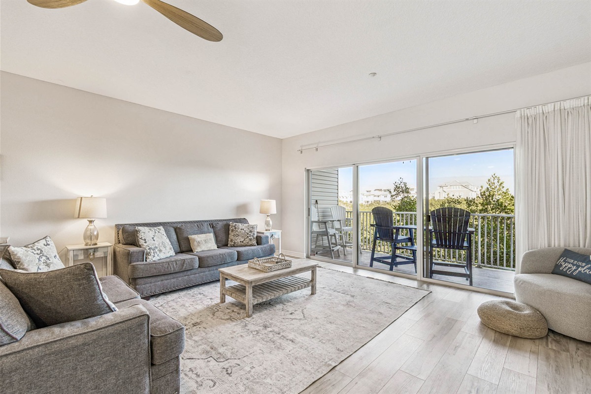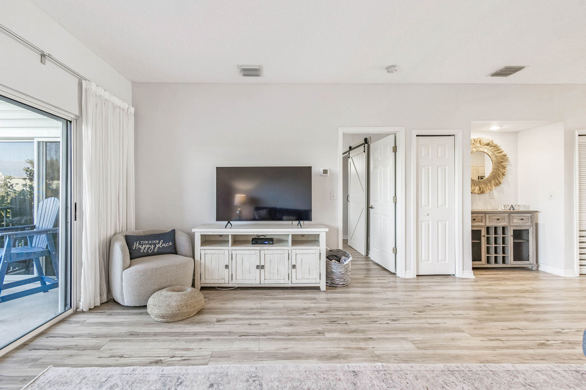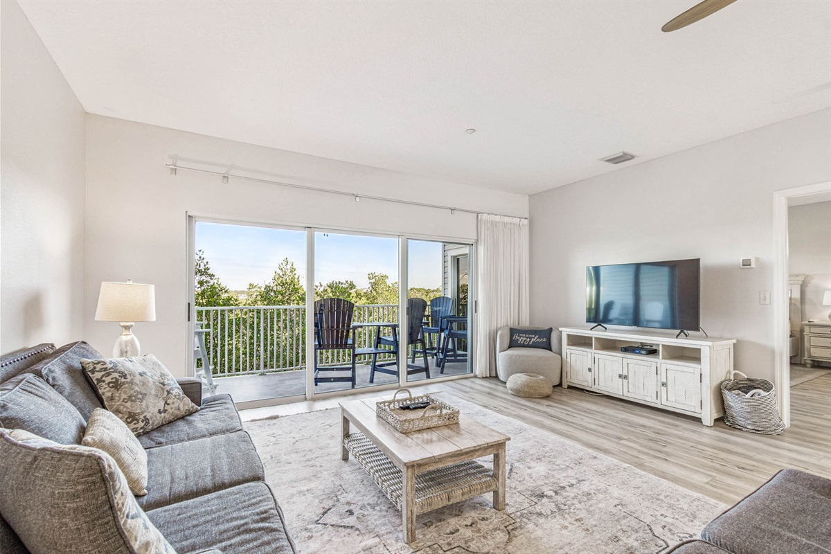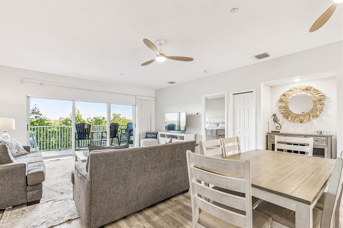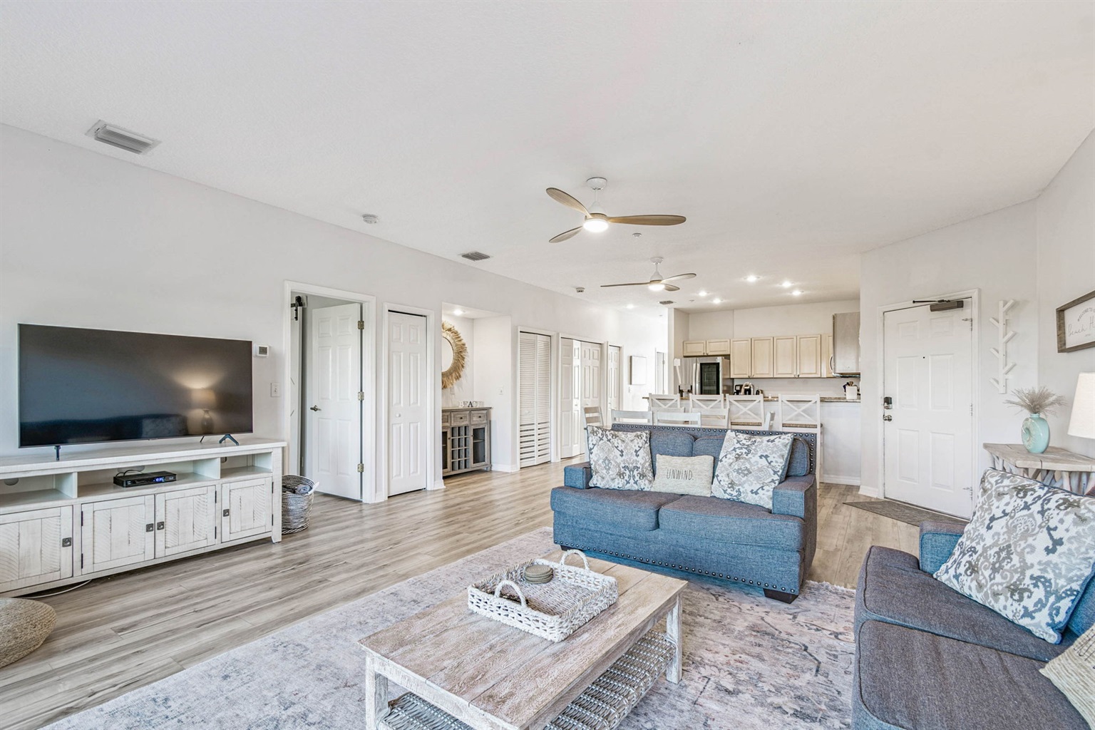 Living Room – Entering the condo right away you will notice the massive open concept living room, kitchen, and dining combination. The Living Room features a plush sofa with queen mattress pullout, loveseat, coffee table, entertainment center and large flat screen TV.