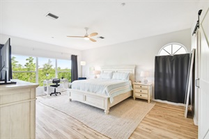 Master Bedroom – An oversized suite with tons of natural light and modern coastal décor. The master features a king size bed set, blackout curtains throughout, desk and office chair (perfect for remote work during your stay!), full length mirror, corner reading chair with lamp and large Samsung flat screen TV, and ensuite bathroom. The ensuite bathroom has a shower, toilet, double-sink vanity with makeup vanity and walk in closet.