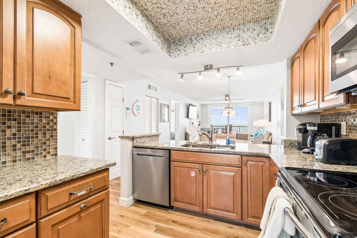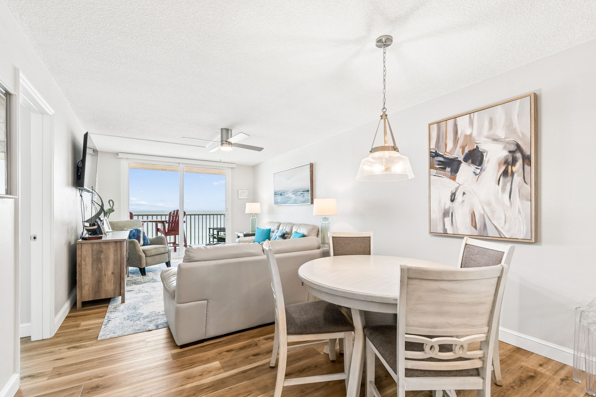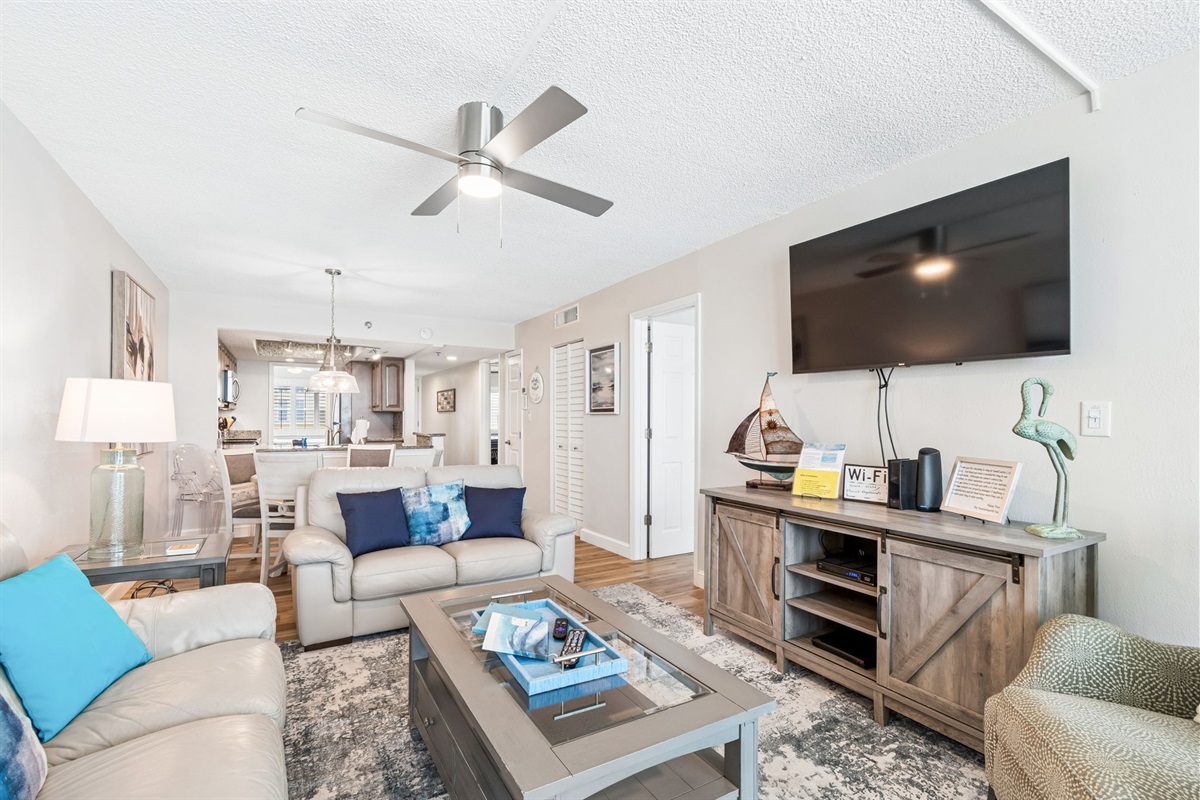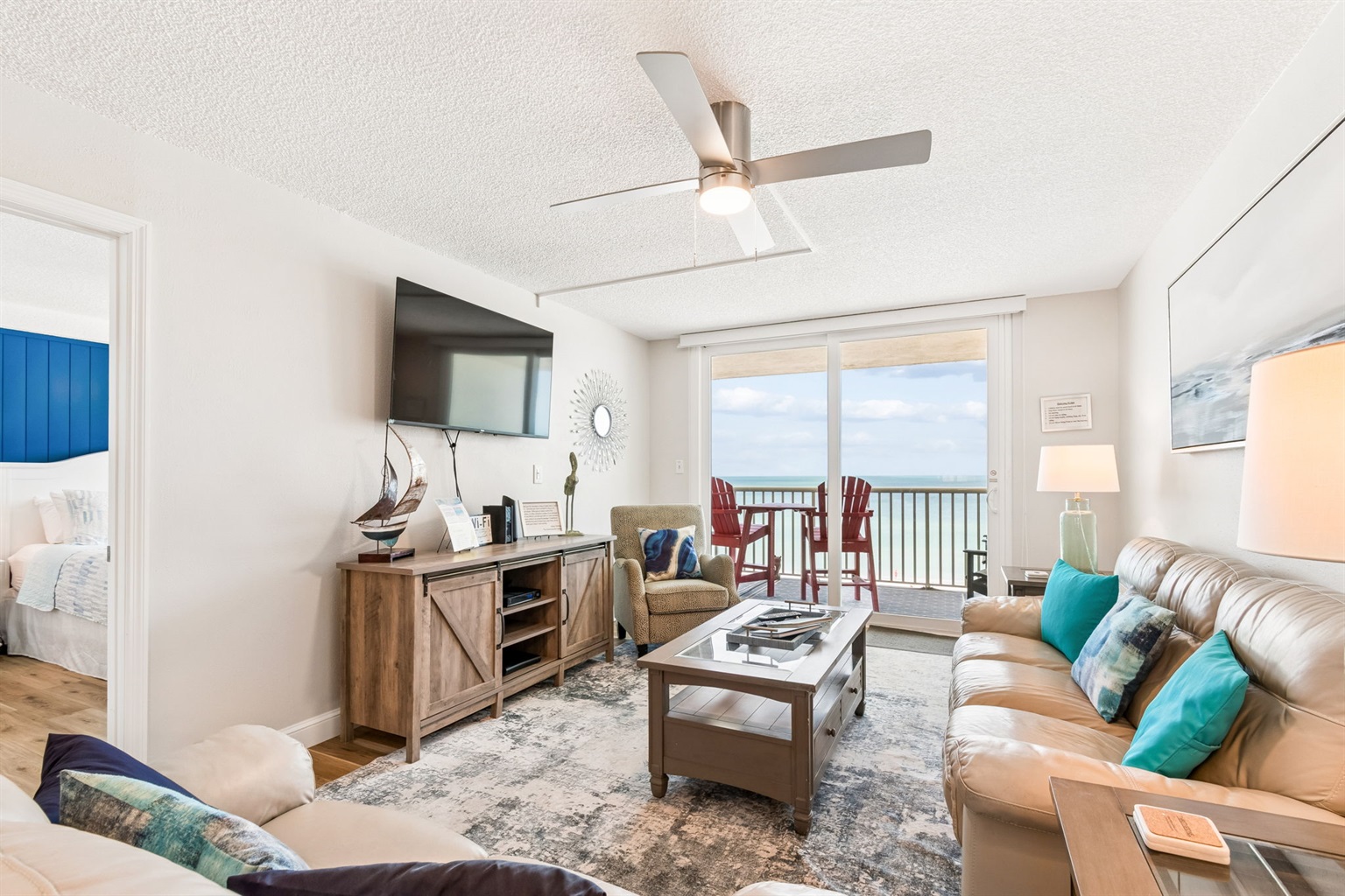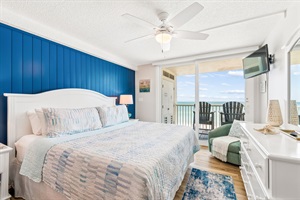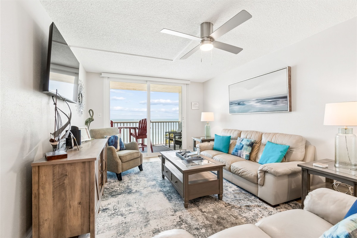 This pristine oceanfront condo features a spacious primary suite with a king bed, private balcony access, and an ensuite bathroom. The second bedroom offers two queen beds, while the third bedroom includes one queen bed. The living room has comfortable leather sofas, a large Smart TV, stunning ocean views and sliding door access to the balcony. The kitchen has everything you need to prepare meals during your stay, and a private washer and dryer are conveniently located in the unit. The oceanfront balcony, accessible from both the living room and primary bedroom, provides stunning Gulf views and the perfect place to relax. Updated coastal furniture and Smart TV's throughout provide guests additional comfort during their stay.