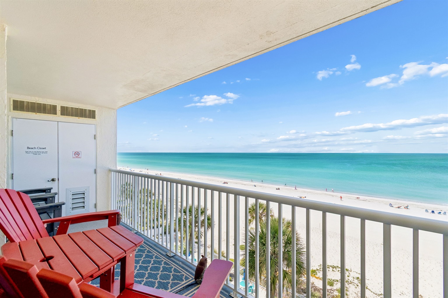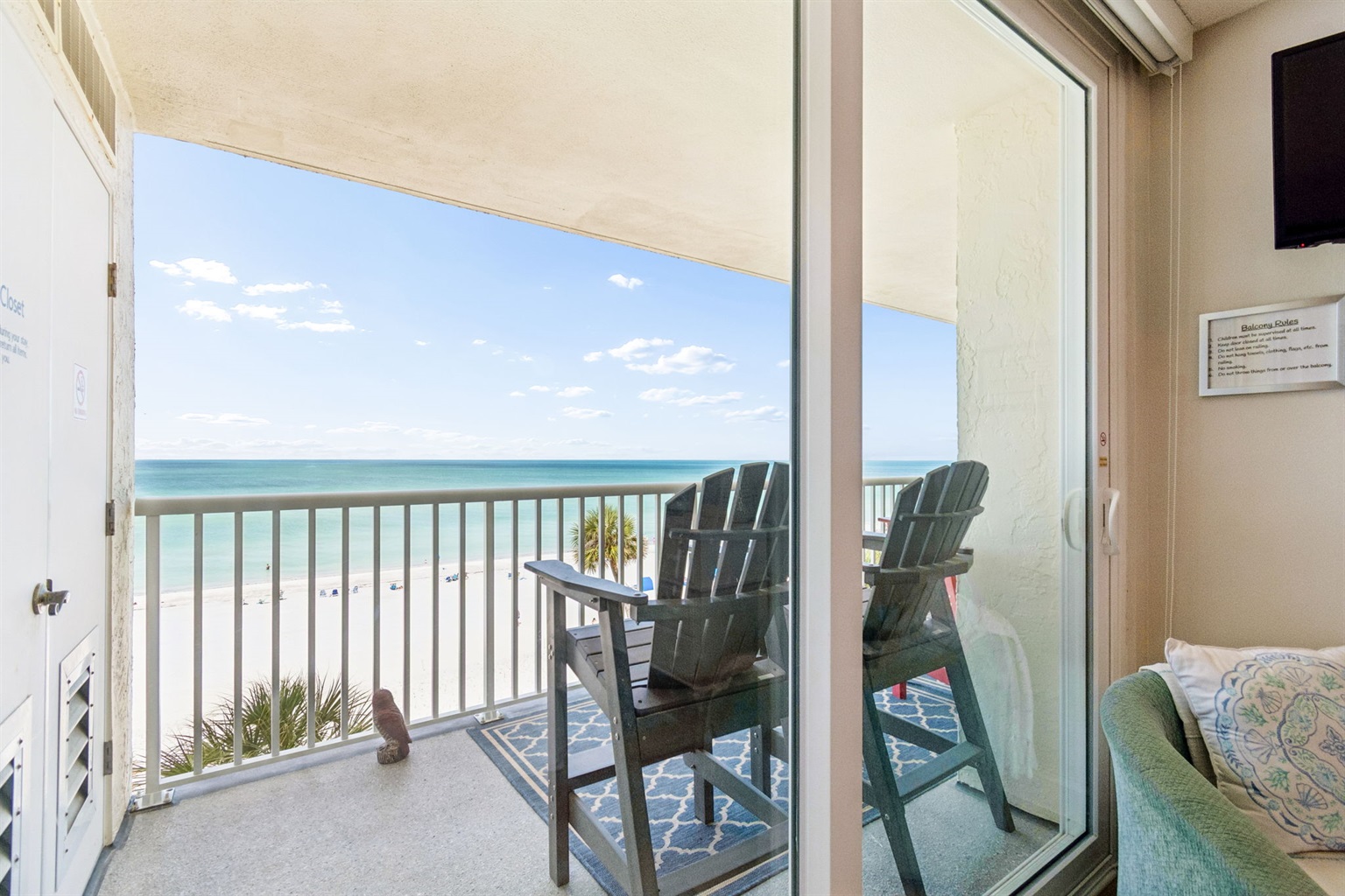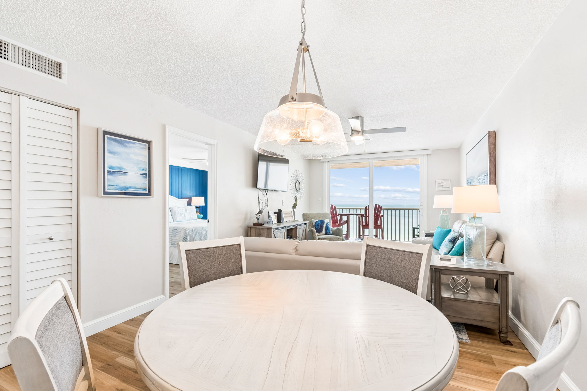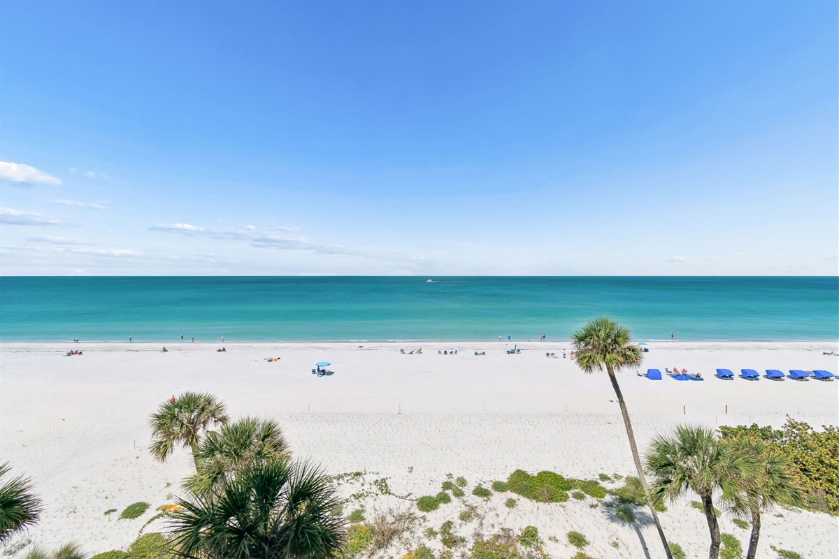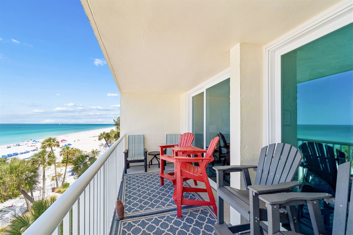 This pristine oceanfront condo features a spacious primary suite with a king bed, private balcony access, and an ensuite bathroom. The second bedroom offers two queen beds, while the third bedroom includes one queen bed. The living room has comfortable leather sofas, a large Smart TV, stunning ocean views and sliding door access to the balcony. The kitchen has everything you need to prepare meals during your stay, and a private washer and dryer are conveniently located in the unit. The oceanfront balcony, accessible from both the living room and primary bedroom, provides stunning Gulf views and the perfect place to relax. Updated coastal furniture and Smart TV's throughout provide guests additional comfort during their stay.