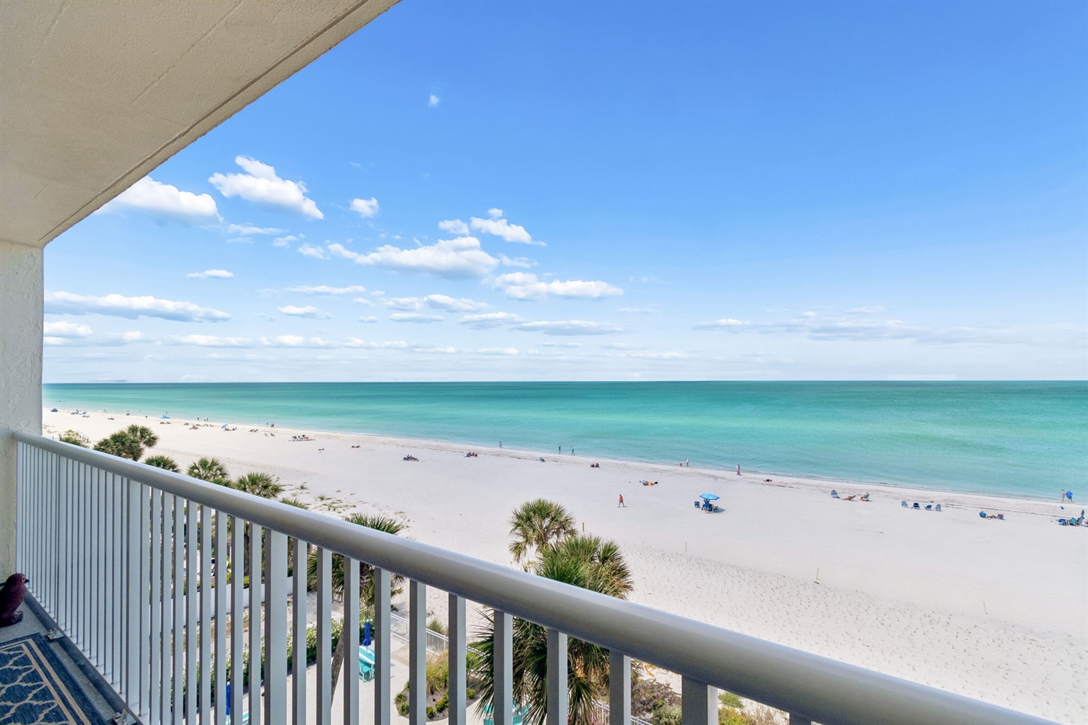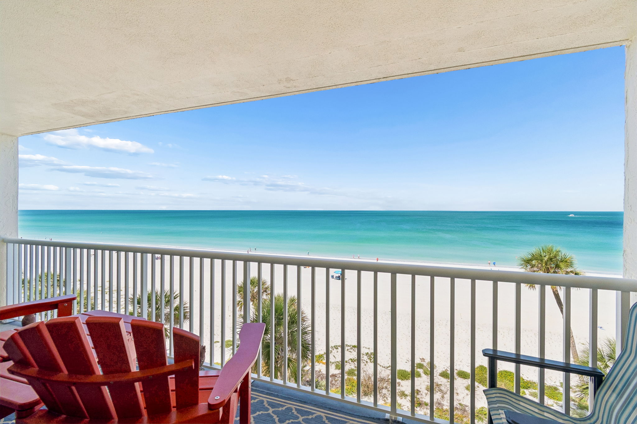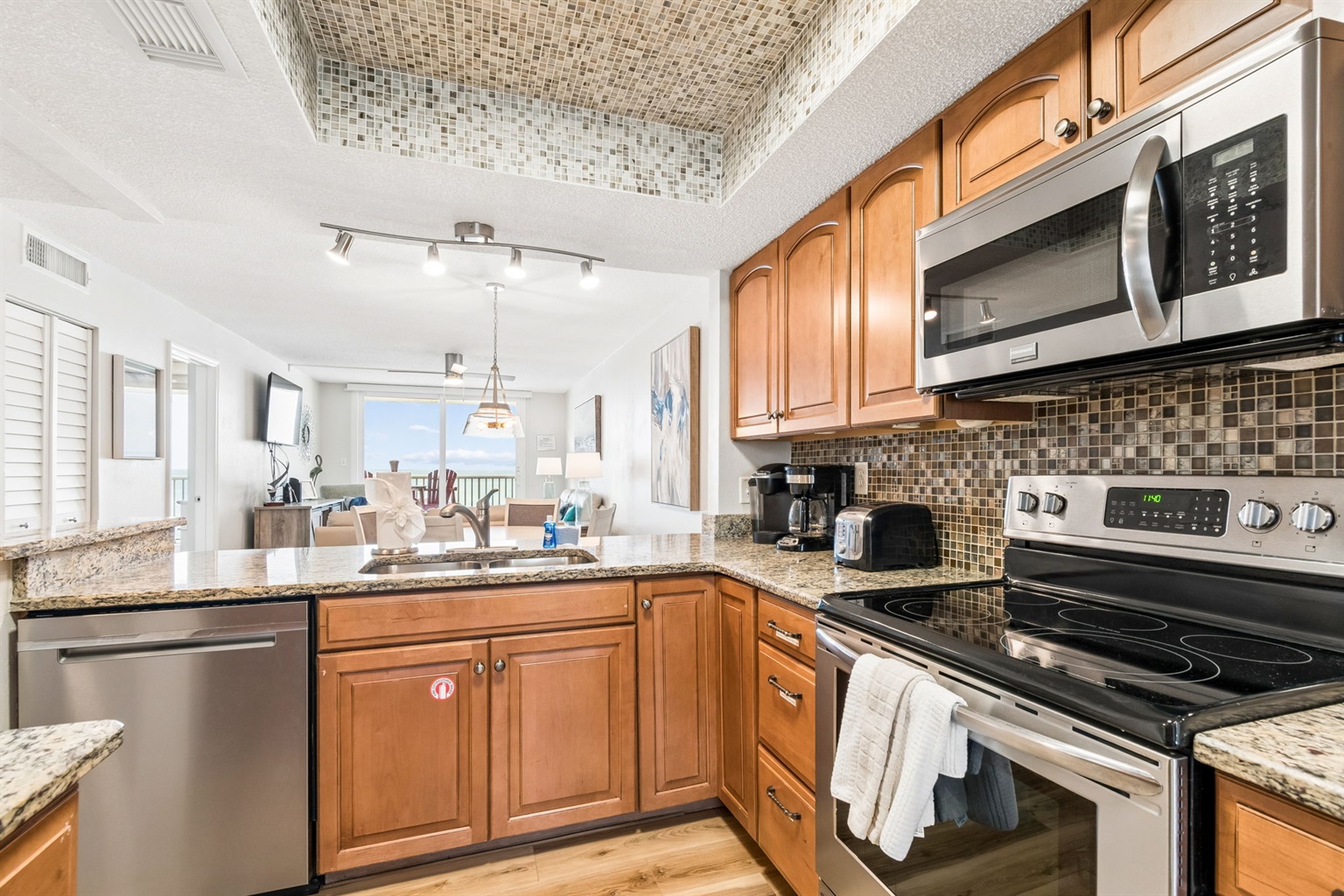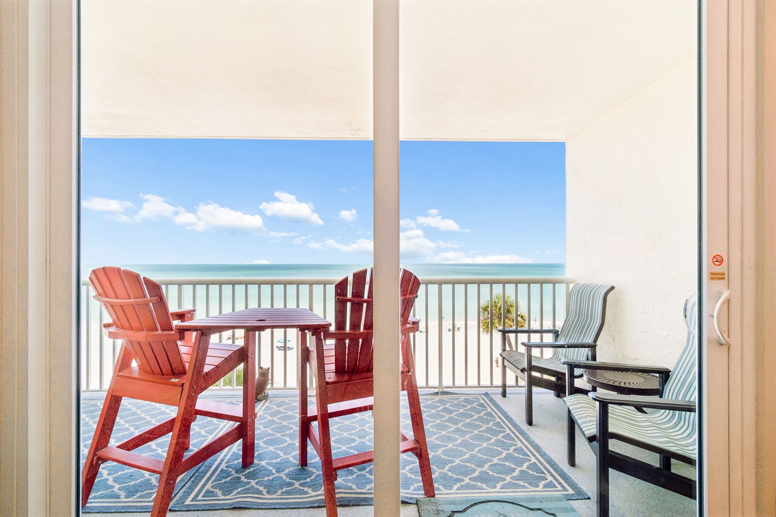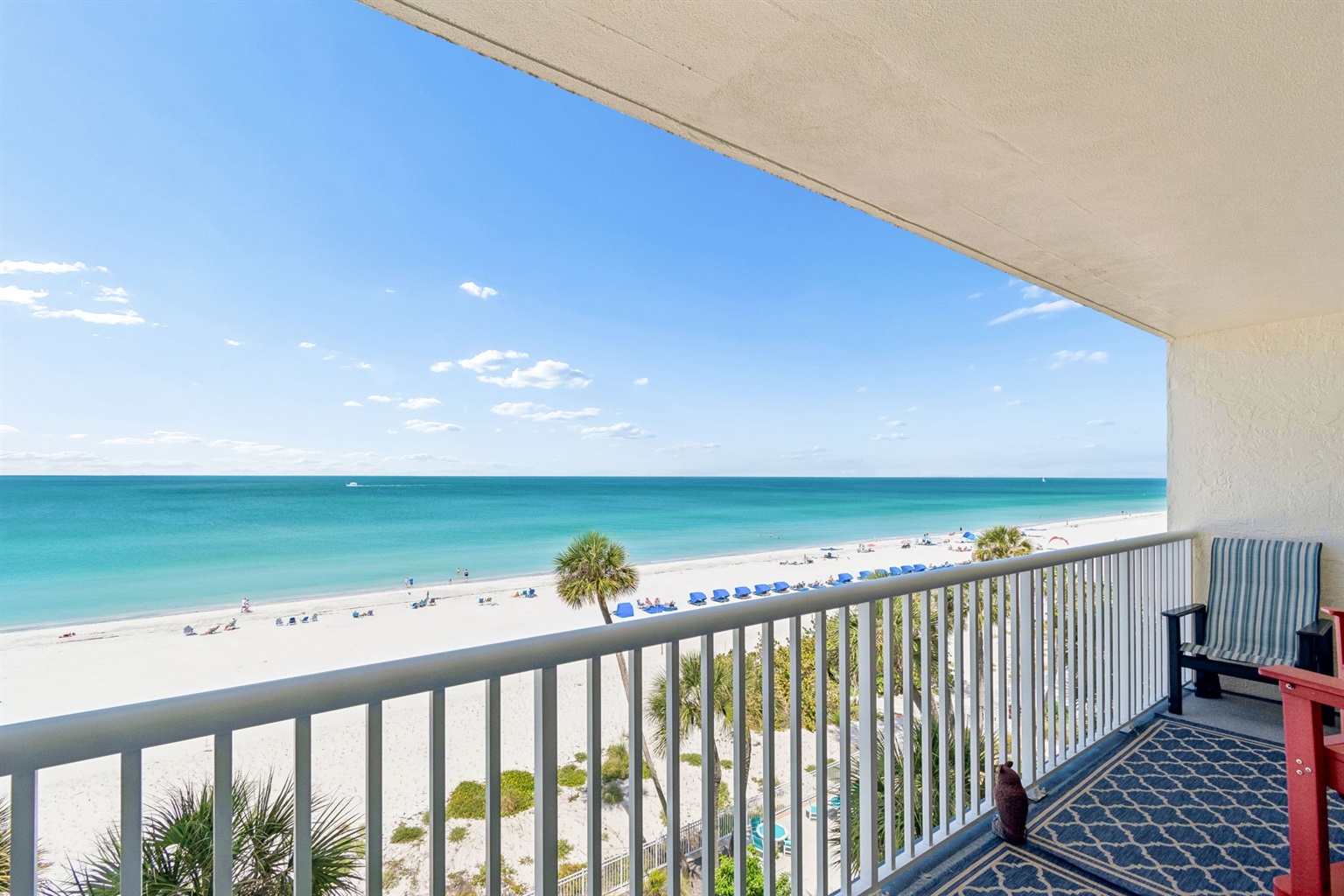This pristine oceanfront condo features a spacious primary suite with a king bed, private balcony access, and an ensuite bathroom. The second bedroom offers two queen beds, while the third bedroom includes one queen bed. The living room has comfortable leather sofas, a large Smart TV, stunning ocean views and sliding door access to the balcony. The kitchen has everything you need to prepare meals during your stay, and a private washer and dryer are conveniently located in the unit. The oceanfront balcony, accessible from both the living room and primary bedroom, provides stunning Gulf views and the perfect place to relax. Updated coastal furniture and Smart TV's throughout provide guests additional comfort during their stay.