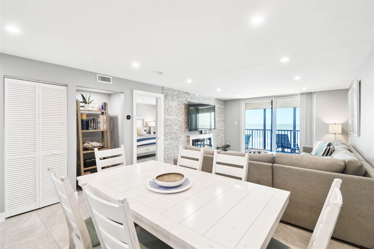 3 Bedrooms • 2 Bathrooms 2 Baths • Sleeps 1-8Experience elevated oceanfront luxury at its finest at this stunning 3-bedroom oceanfront penthouse condo. Step into the living room that boasts of shimmering ocean views and a warm and cozy atmosphere by way of the stone accent wall and electric fireplace. The kitchen dazzles with luxury marble countertops, shaker cabinets and stainless appliances. The master bedroom features a king size mattress, private slider access to the balcony and marble bathroom ensuite with dual shower heads. The second bedroom makes this condo perfect for the family with two twin over full bunkbeds. Even more, this property includes premium features throughout like Alexa clocks and USB chargers in each bedroom and a coffee station to keep you energized. Step outside and enjoy direct access to the beach and dip your toes in the heated pool or wind down your day in the hot tub - it doesn't get more relaxing than this! Perfect for couples looking for a romantic retreat or families escaping for a beach getaway, this condo has everything you need for an unforgettable experience.