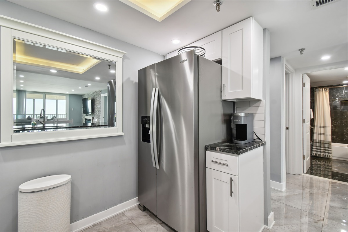 Kitchen – dazzling countertops and stone accents featuring stainless steel appliances and updated shaker cabinets. Stocked with cookware and bakeware, everything you need to make meals while away.