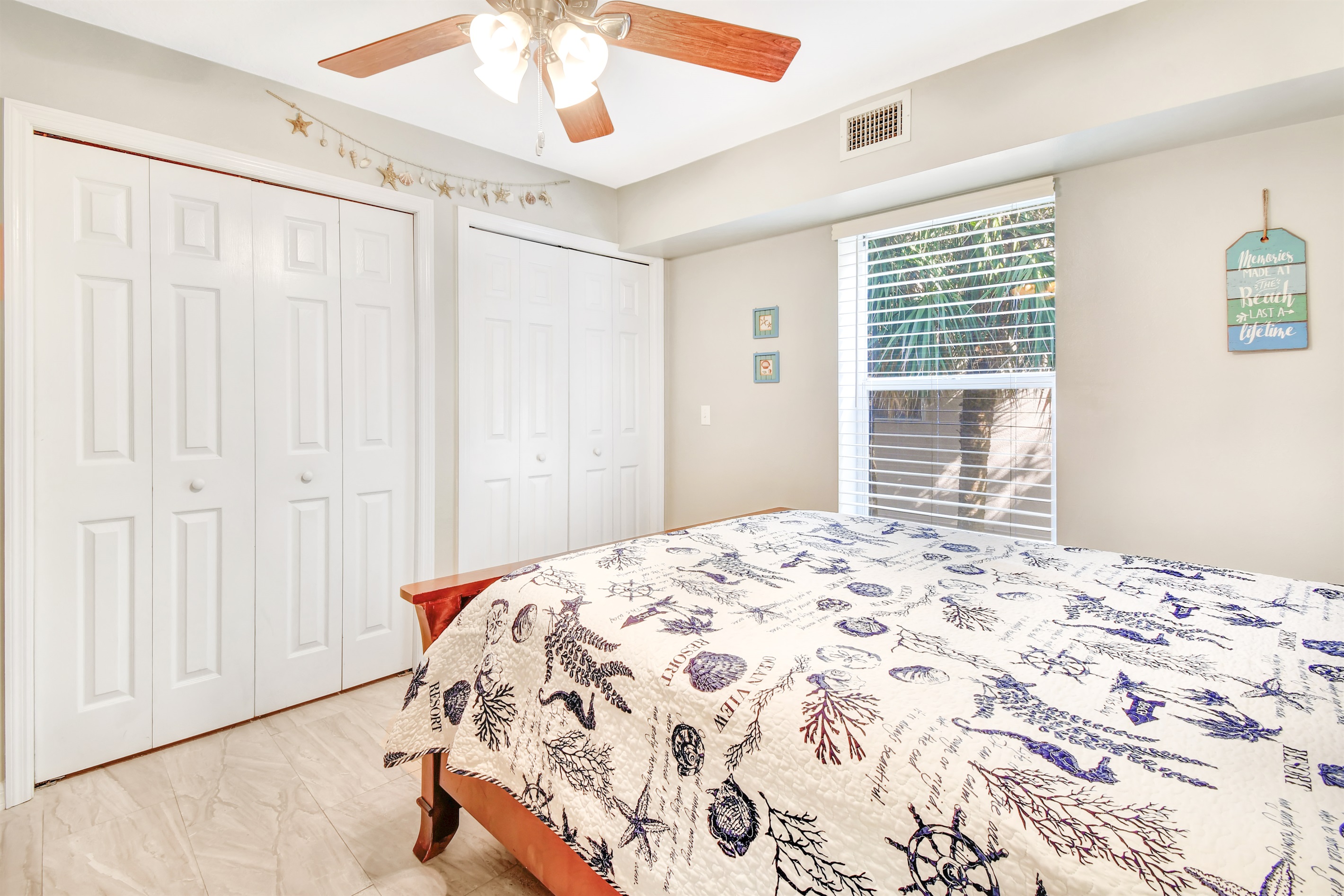 Second Bedroom – Entering the condo down the hall on the right is the second bedroom with Queen Size Mattress and flat screen TV with cable and Smart TV. In the closet you will find all of the beach toys you could need for your stay such as beach chairs, umbrella and coolers.