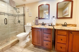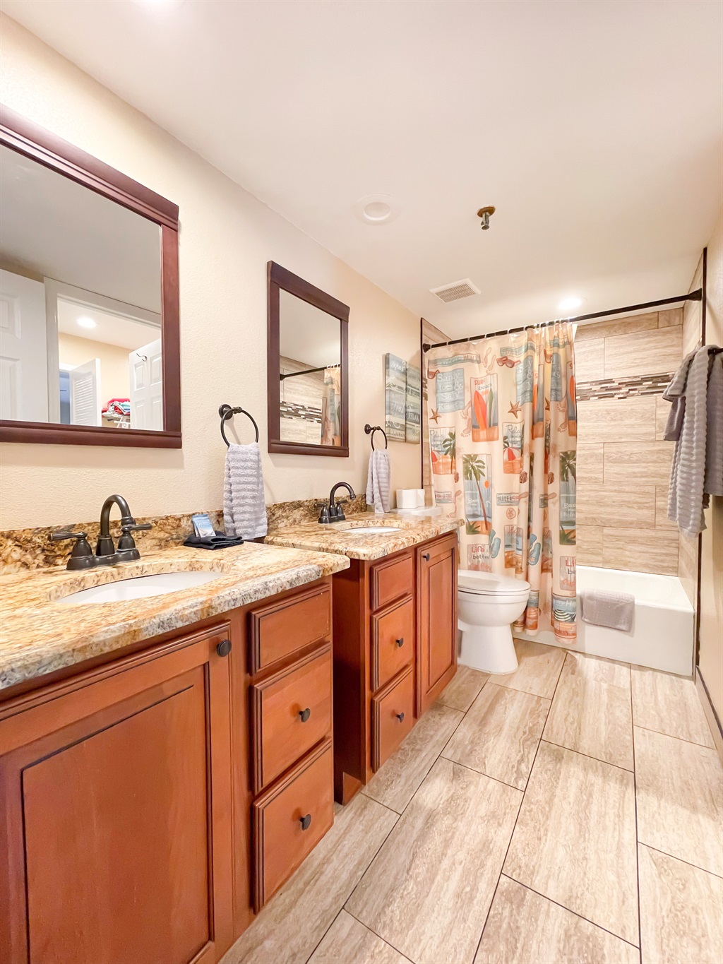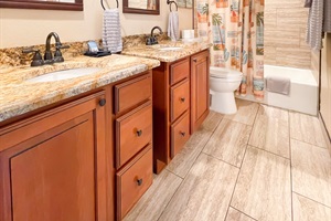 Hallway Bathroom – Double vanity sinks with shower/tub combination.